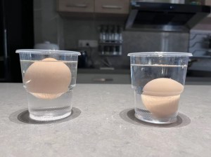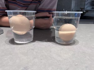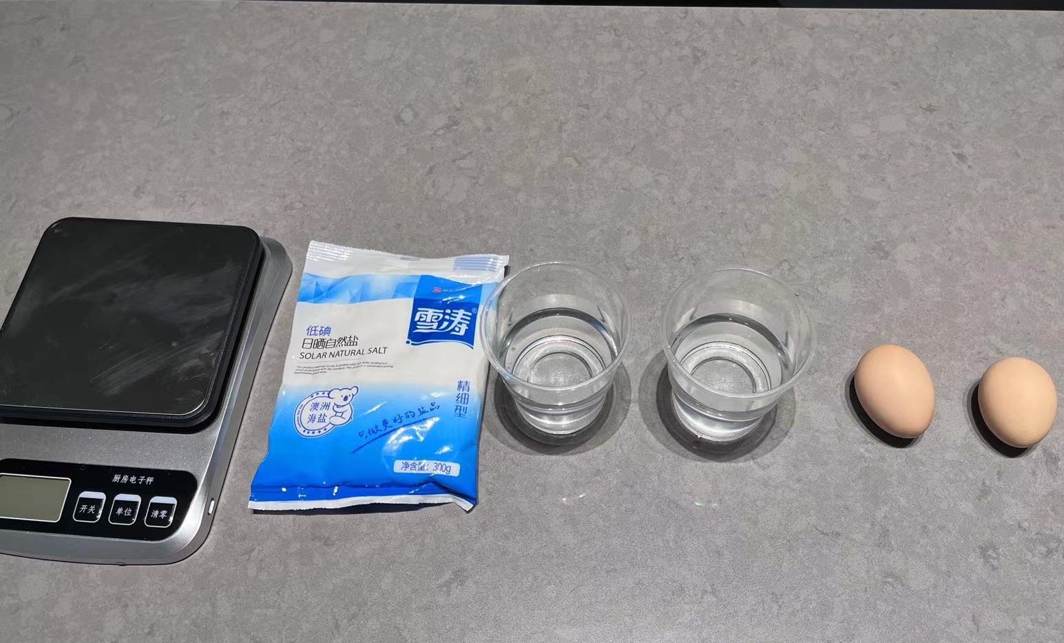 实验材料:电子秤,海盐,两杯清水,两个鸡蛋